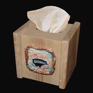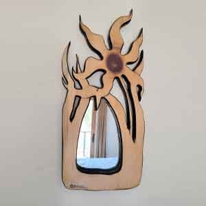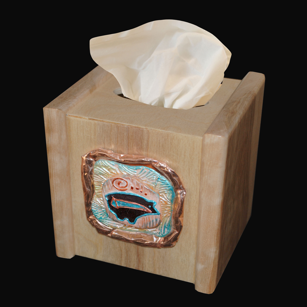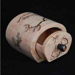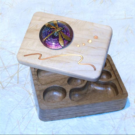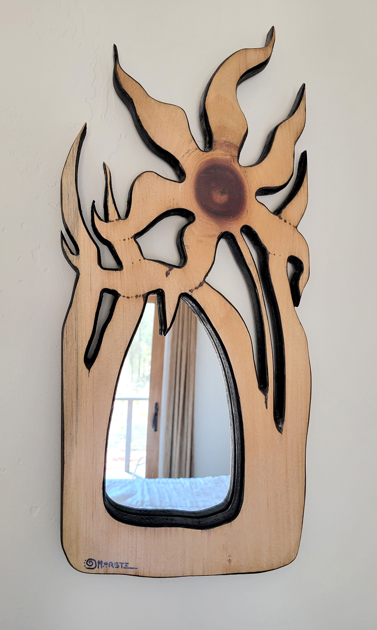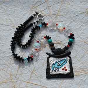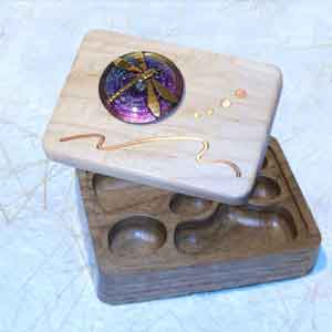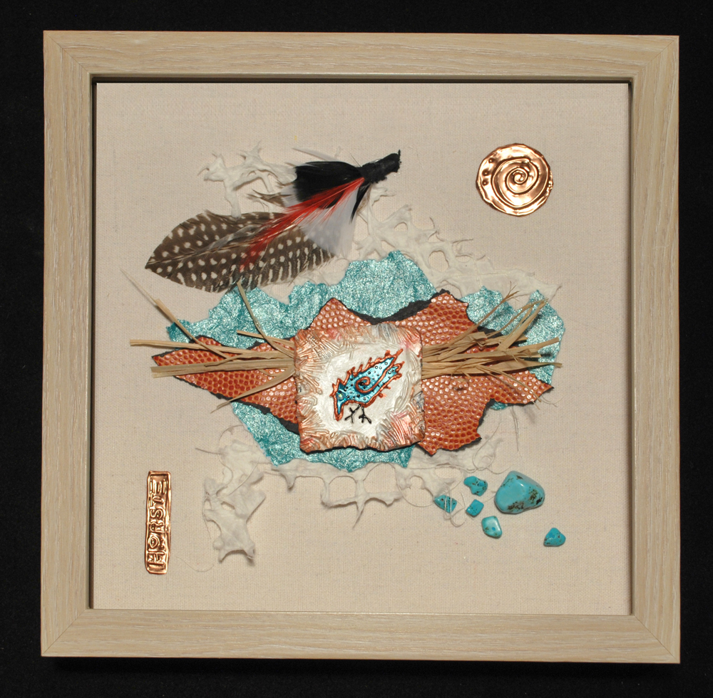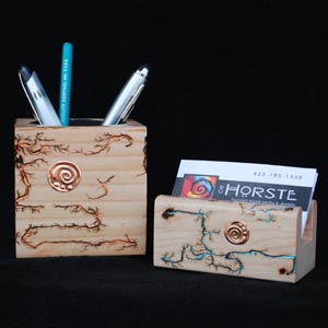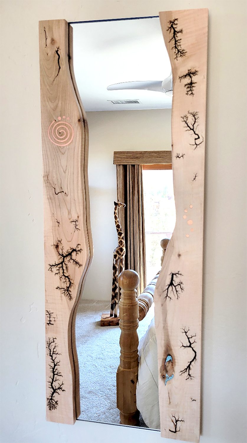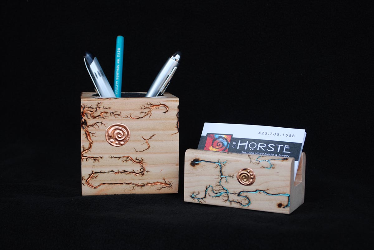 I confess to being bored using the same surfaces and I am always exploring ways to add dimension to my clay and wood designs. I use a variety of techniques and methods to achieve deep textures in each piece. I often combine metal oxides, alcohol inks and aniline dyes for coloring both clay and wood surfaces, and use a “repousse” technique of embossing metals. I currently am experimenting with what I call “Tesla Spark Art”. It utilizes the Lichtenburg process of applying 2K volts of electricity to create unique burn patterns that later I embellish with stones, Japanese paper, crystals, beads, and hand carved clay stamps.
